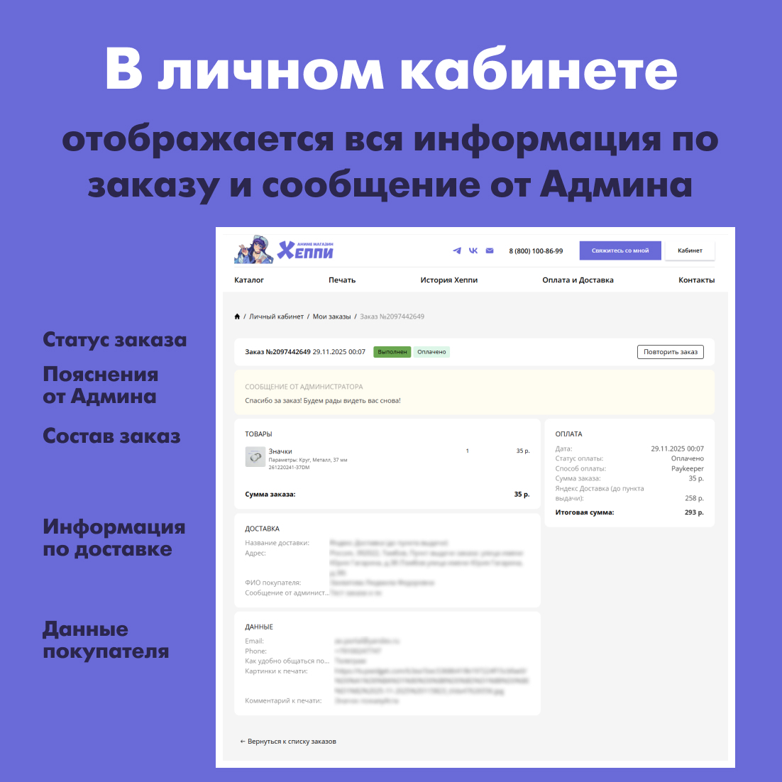 Детали заказа, статус и даже сообщение от Админа что и как там на производстве в праздники теперь есть в личном кабинете!