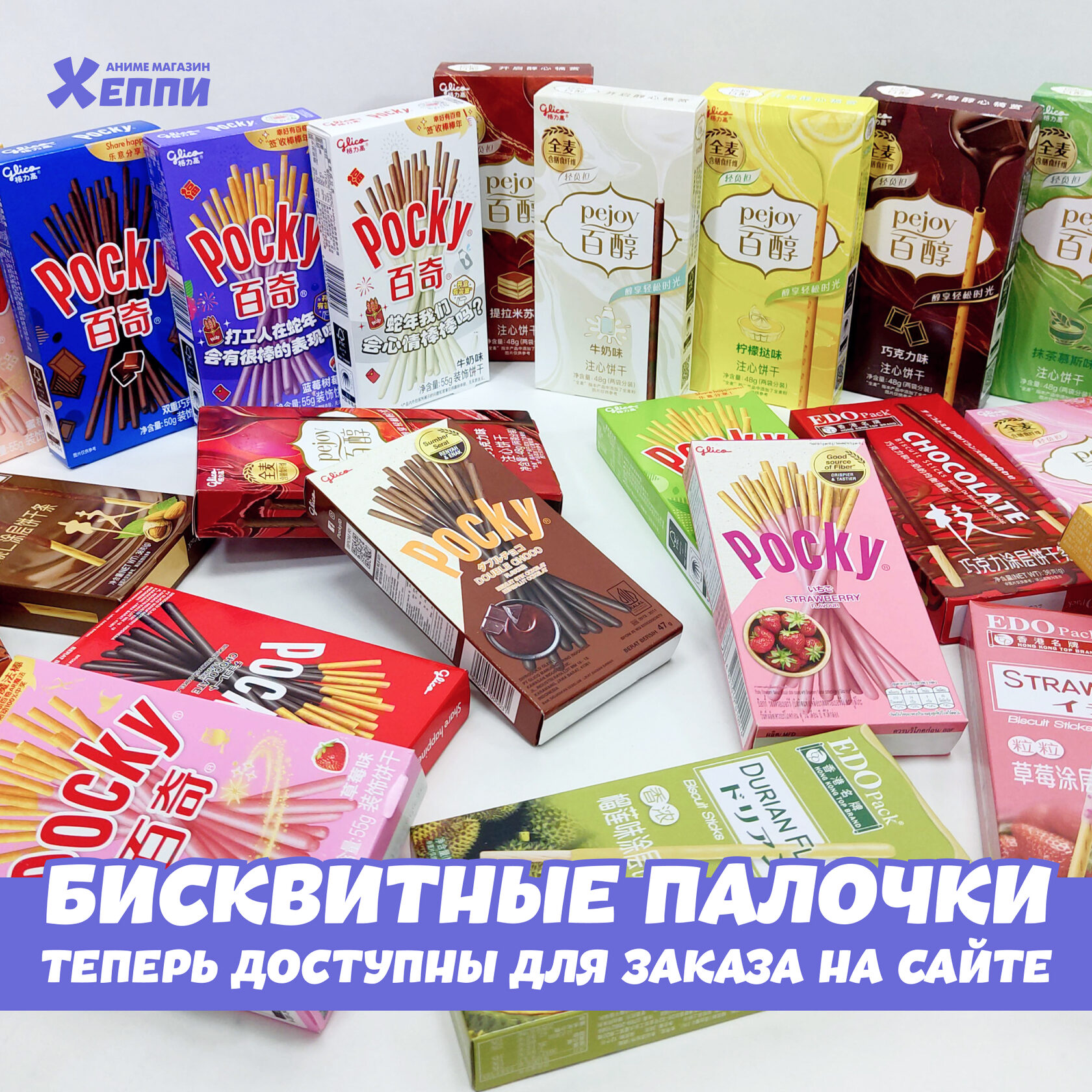 Все многообразие палочек в глазури Edo Pack, Pejoy и Pocky теперь не только в магазине, но и на сайте с самовывозом или доставкой по всей РФ. Выбирайте, экспериментируйте и пейте чаек с хрустящими палочками.